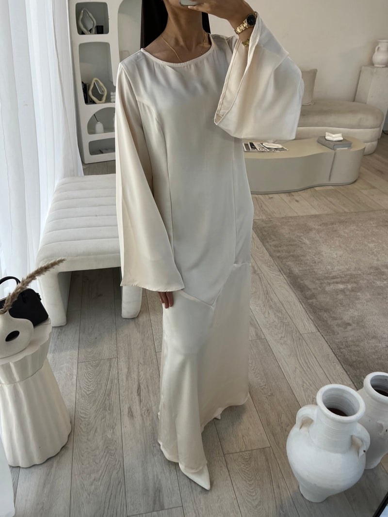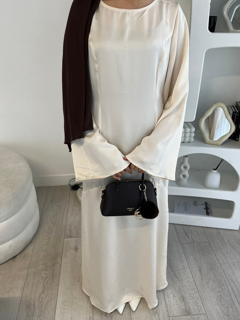 Our stunning beige satin silk effect dress comes in a lightweight flowy fabric with an elegant belle sleeve and tie back belt for adjustment.