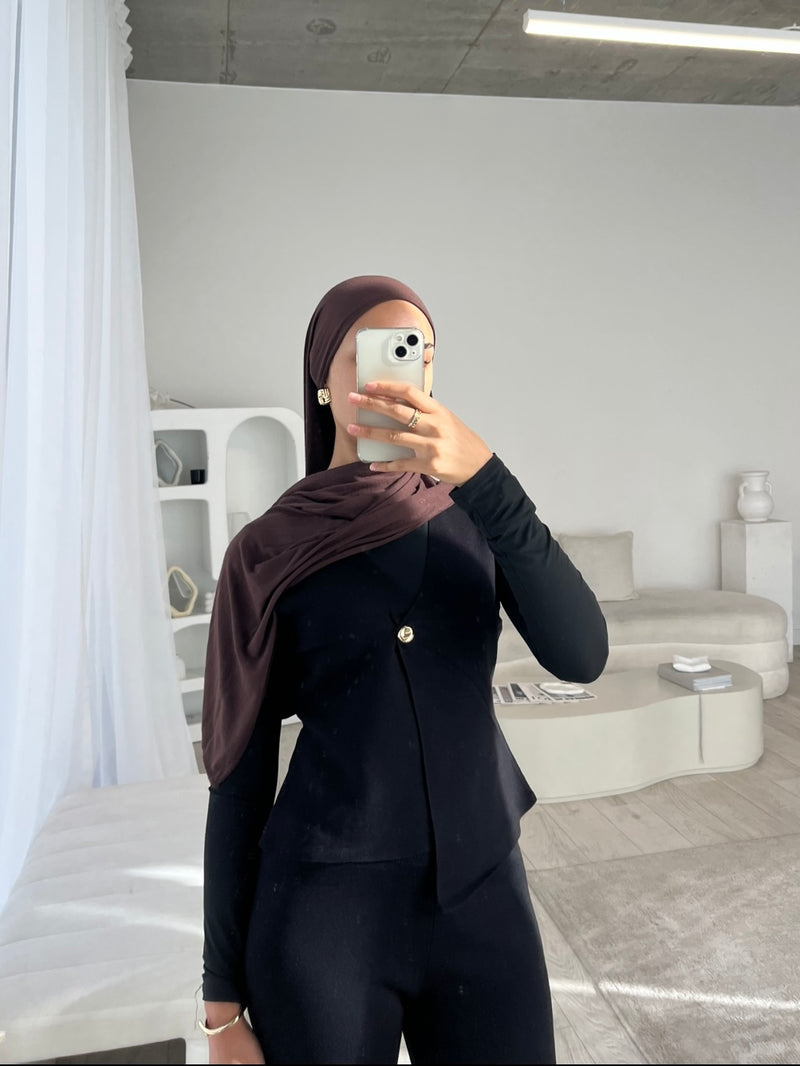 It comes with a sleeveless vest cardigan and gold button detail and wide leg trouser perfect for Autumn.